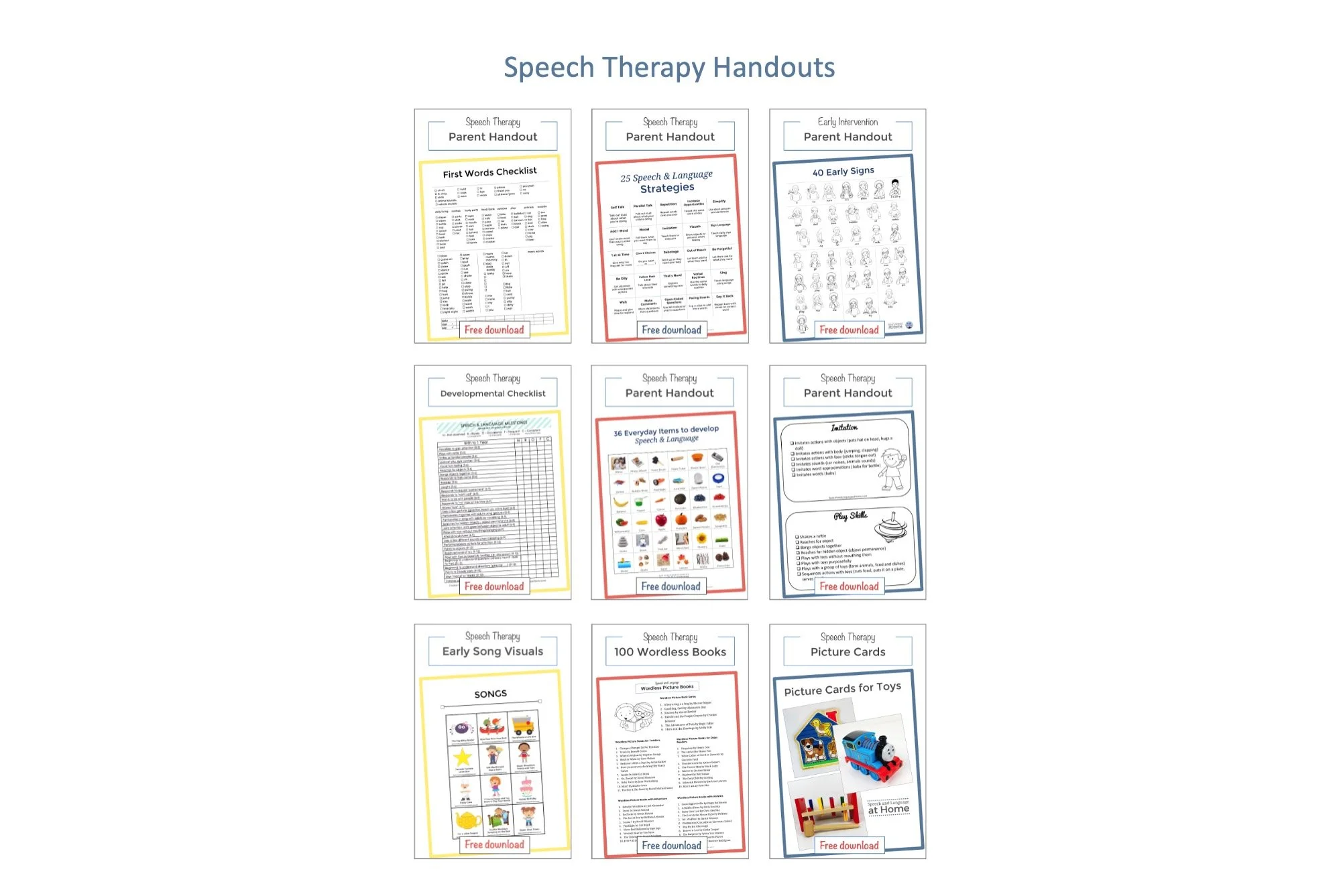 The fourth section of handouts was created to support speech development. These are a group of one-page homework printables based for families.