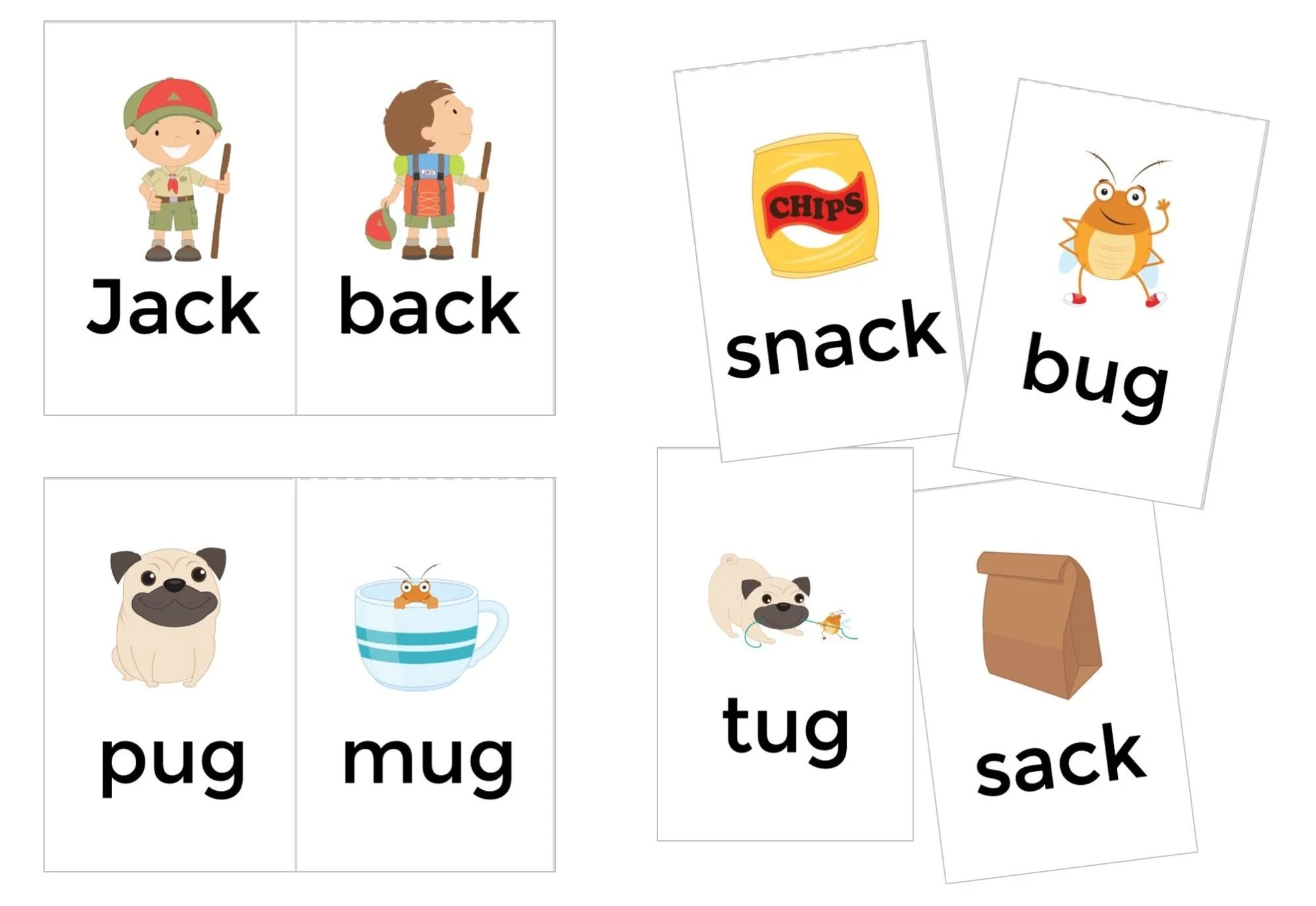Rhyming: Jack, back, snack, sack, pug, much, bug, tug