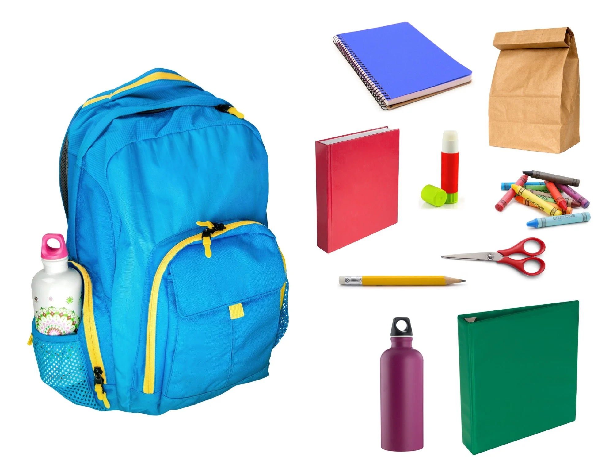 Labeling: notebook, lunch, book, glue stick, crayons, pencil, scissors, water bottle, binder