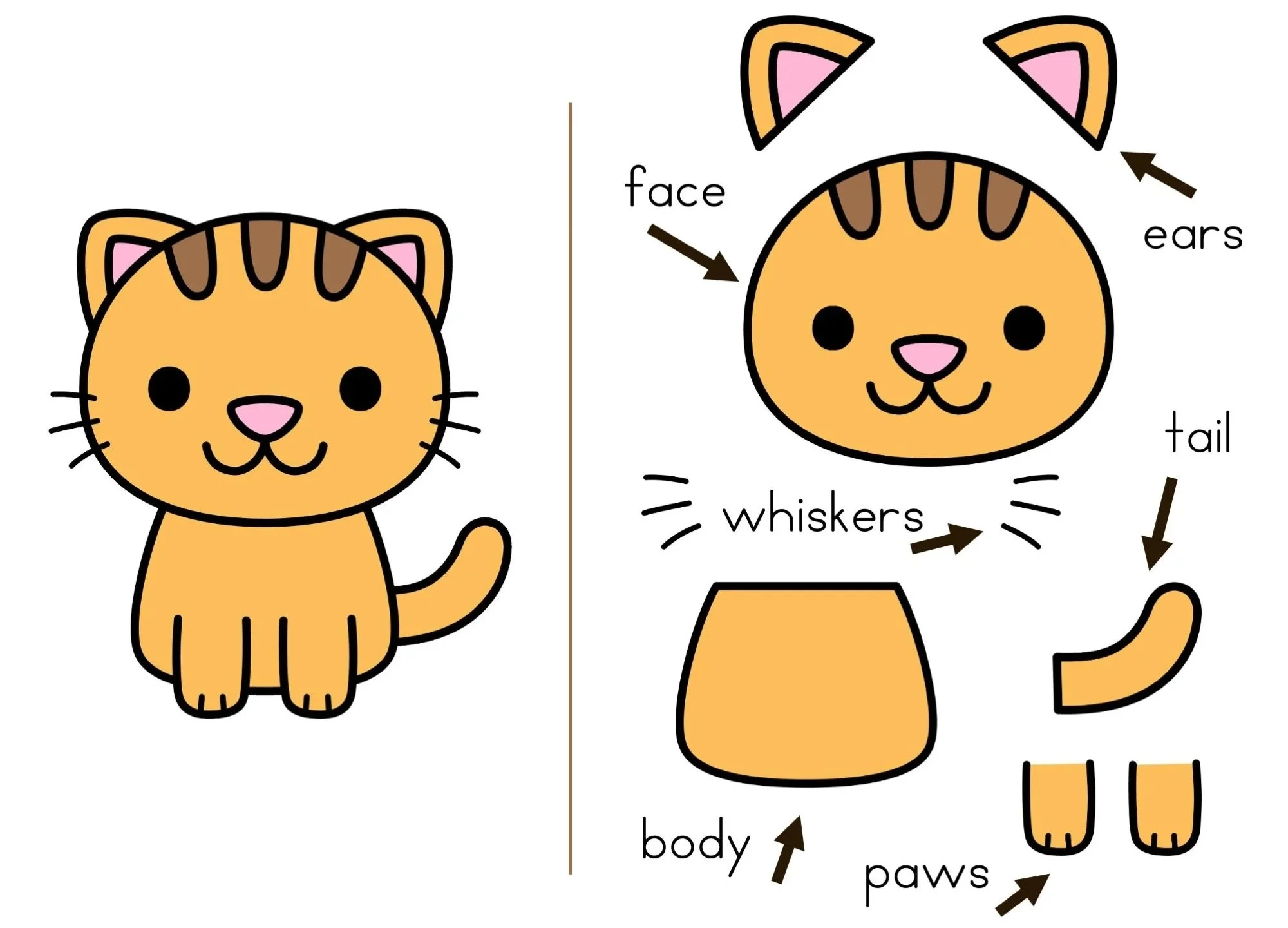 Practice vocabulary by learning the parts of a cat (tail, whiskers, paws, ears).
