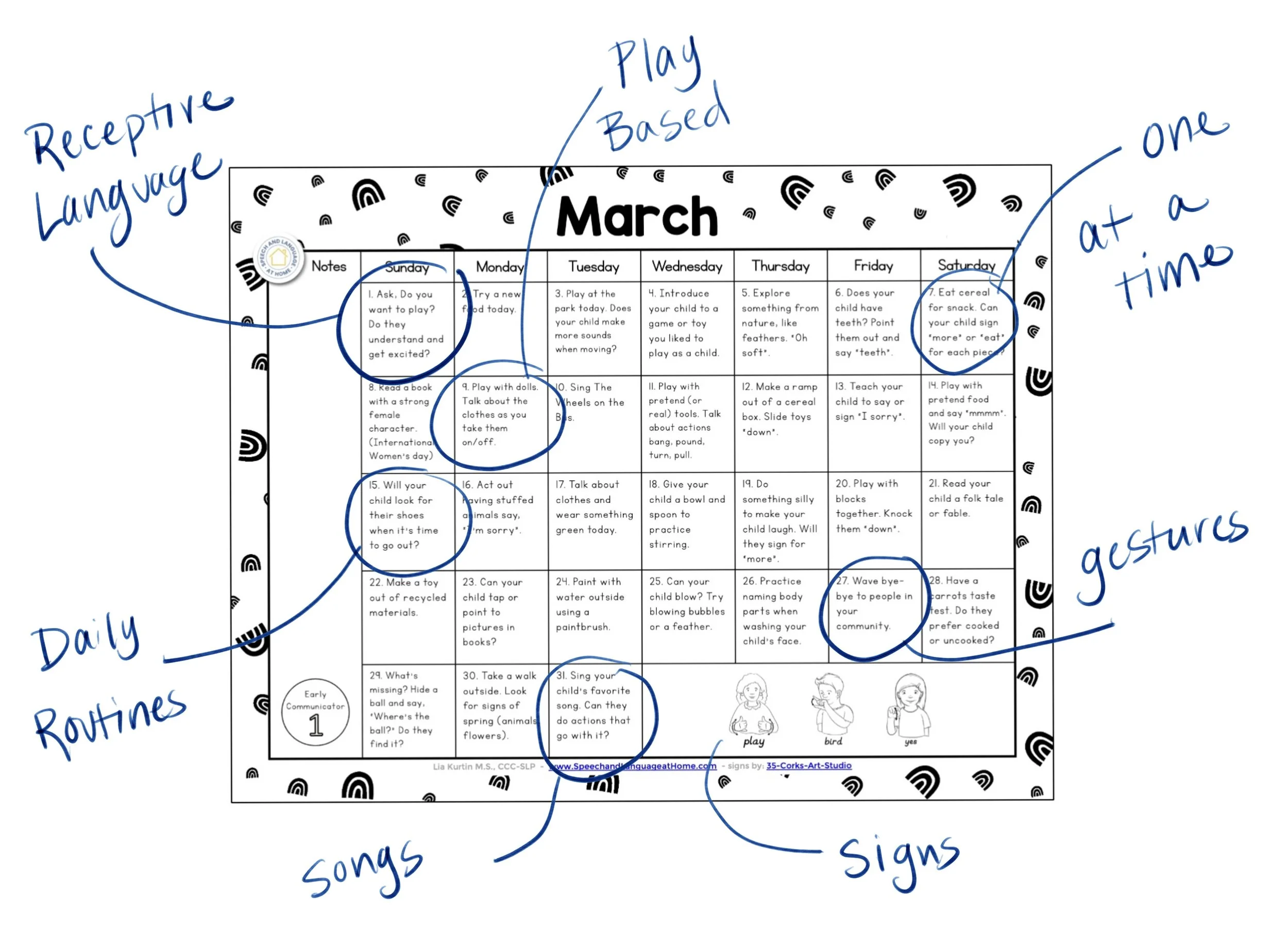 Other strategies commonly embedded in the calendar include imitation, joint attention, repetition, and the use of signs to support verbal language.